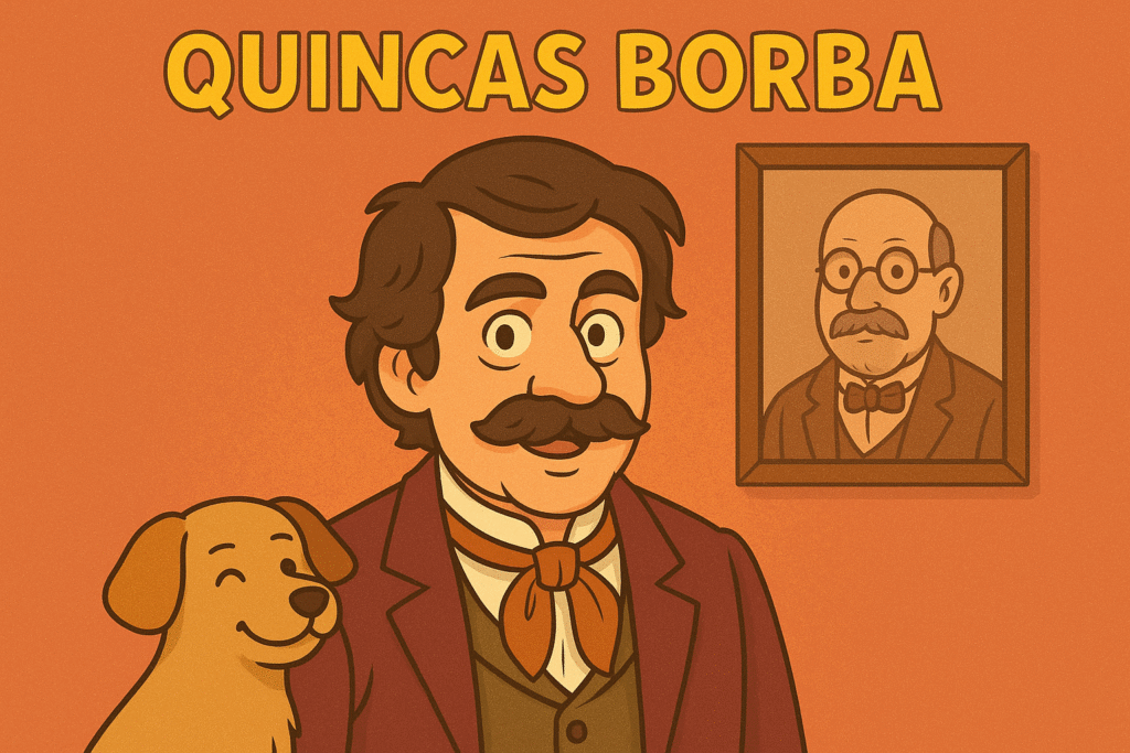 Quincas Borba, Rubião e sua irmã viviam em Barbacena-MG, cidade conhecida, na época, por seu grande número de manicômios. Tanto Quincas quanto a irmã acabam morrendo. Com o falecimento do amigo, Rubião descobre que foi nomeado seu único herdeiro, com a condição de cuidar de seu cão, também chamado Quincas Borba. De posse da herança, o ex-professor parte para o Rio de Janeiro, a então Corte do Império, instalando-se confortavelmente com um criado espanhol a quem delega os cuidados com o cachorro.